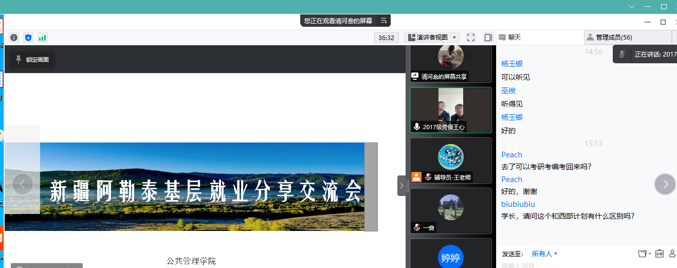 会上,王心、丁时鑫结合自身在新疆的工作经历和心路历程,向与会的学弟学妹们分享了基层工作经验及个人的收获和体会,并就大家关心的环境适应、薪资福利、个人发展等问题进行详细的解答。