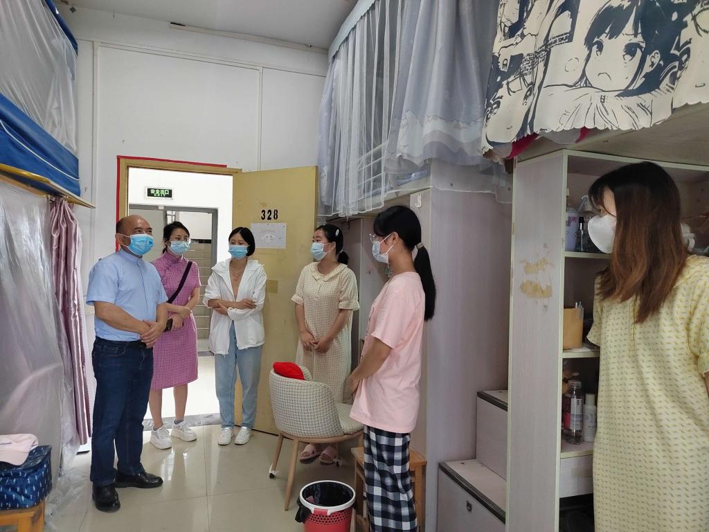 崔广平来到榕叶苑三舍看望了刚返校的学生,他要求同学们要提升安全意识,积极配合学校的疫情防控工作,并鼓励大家珍惜时间,努力学习。
