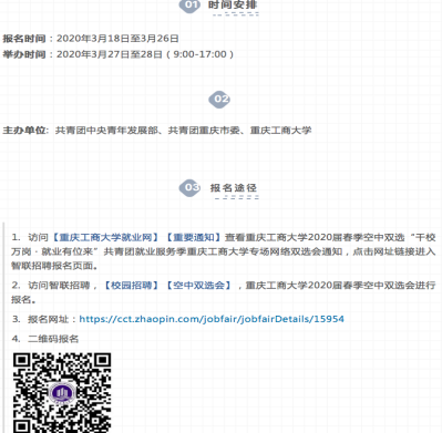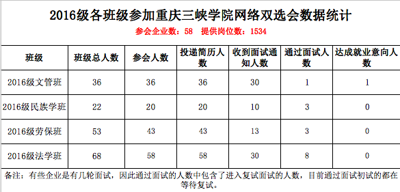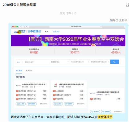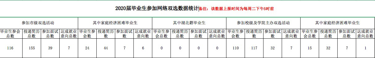 2.加强宣传动员,监督落实就业成效。随着网络招聘会的陆续开展,积极动员、组织和指导我院毕业生参加教育部24365校园招聘服务活动、“就在山城 圆梦青春”重庆市大型网络双选活动、“重庆三峡学院2020年毕业生网络视频双选会”及其他兄弟院校举办的春季网络招聘活动。要求学生积极参加各类网络双选会,做到3月8日前网上宣传全覆盖,学生3月12日前网上注册全覆盖,通过每周汇总简历截图及参加双选会数据情况,督促学生实现网络就业。3月18日,我院157名未就业毕业生积极参加本校网络双选会。