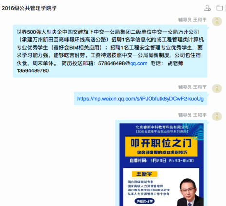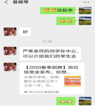 1.加强就业指导,做好就业服务。凝聚我院全体师生力量,收集重庆乃至全国范围内各大人才网微信公众号、校园招聘QQ群等平台,充分利用好大学生就业新职业网、重庆高校毕业生就业信息网、重庆人力资源和社会保障网等国家级、市级网络平台和前程无忧、智联招聘、BOSS直聘、中华英才网,宣传开展“送岗位、送政策、送信息”服务,将就业指导、招聘资讯第一时间精准推送给毕业生。