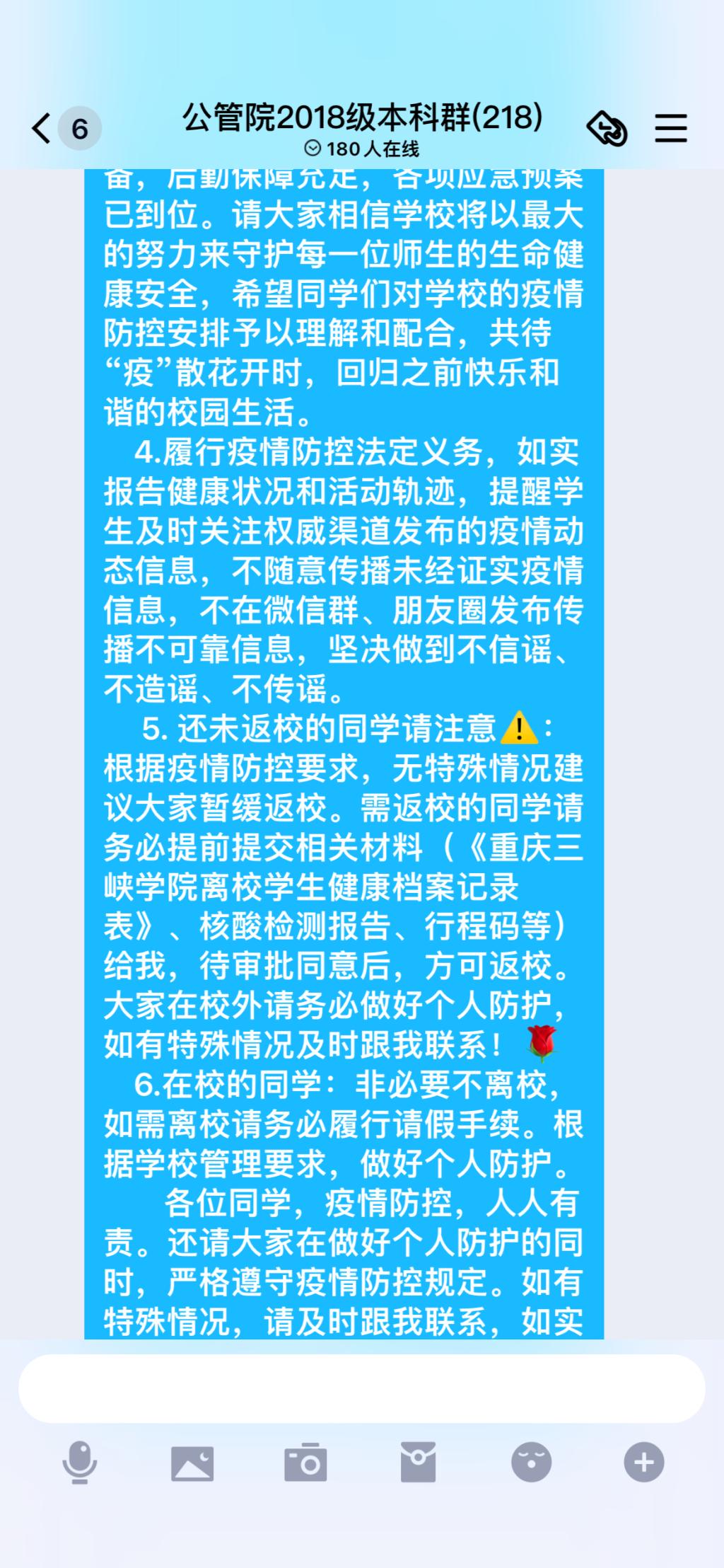 班会上,辅导员通报当前疫情形势,传达了习近平总书记关于疫情防控工作重要指示精神,讲解了学校防控要求和管控措施,引导学生担起新时代大学生的责任和使命,团结一心,并肩抗疫。同时,辅导员强调要以正确的心态对待疫情防控,配合、理解学校的防控要求和管控措施,非必要不离校,避免扎堆聚集,做好个人健康监测,按要求填写“健康日志”,做到不信谣、不传谣、不造谣。