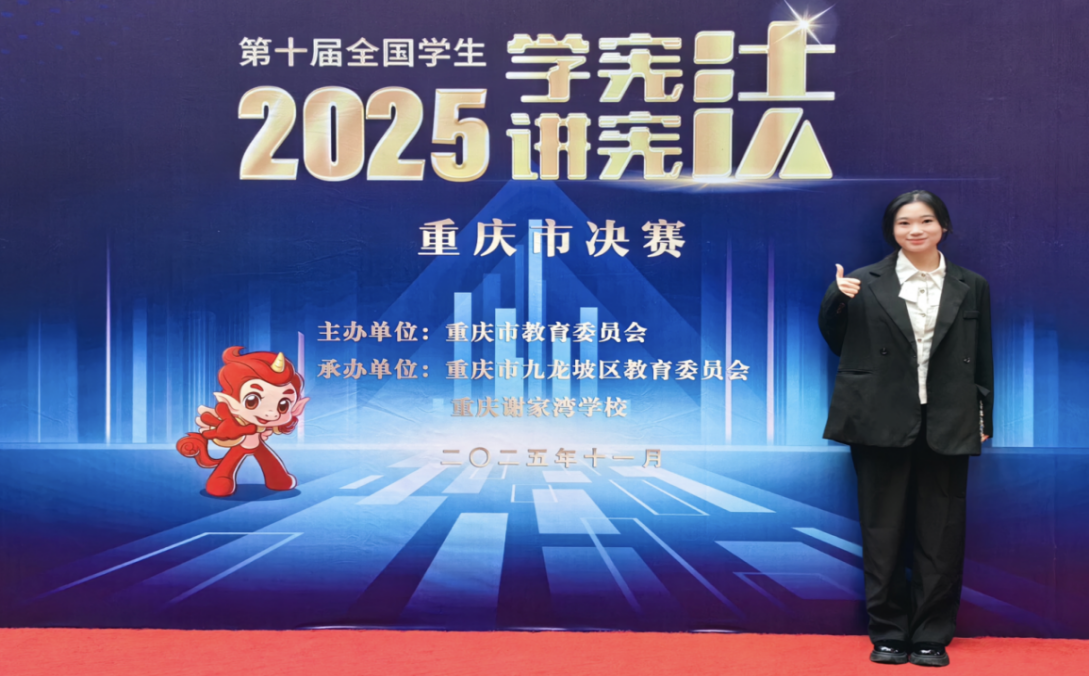 11月22日—23日,由重庆市教委主办的第十届全国学生“学宪法 讲宪法”活动重庆市决赛在重庆谢家湾学校顺利举办。我院2023级法学专业学生孙婧妍在比赛中斩获佳绩。