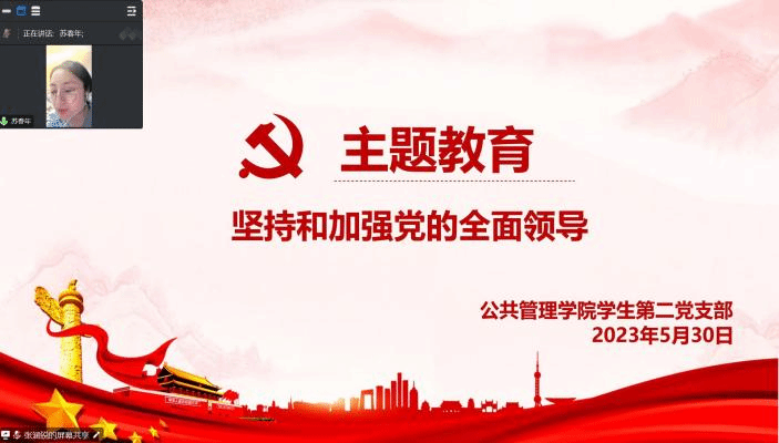为了全面贯彻落实中共重庆三峡学院委员会《关于在全校开展学习贯彻习近平新时代中国特色社会主义思想主题教育的实施方案》要求,2023年5月30日,我院学生党支部通过腾讯会议召开了“坚持和加强党的全面领导”主题教育集中学习。本次主题教育由学生第一党支部书记邹倩同志、学生第二党支部组织兼纪检委员苏春年同志主持。学院学生党支部全体党员参与学习。
